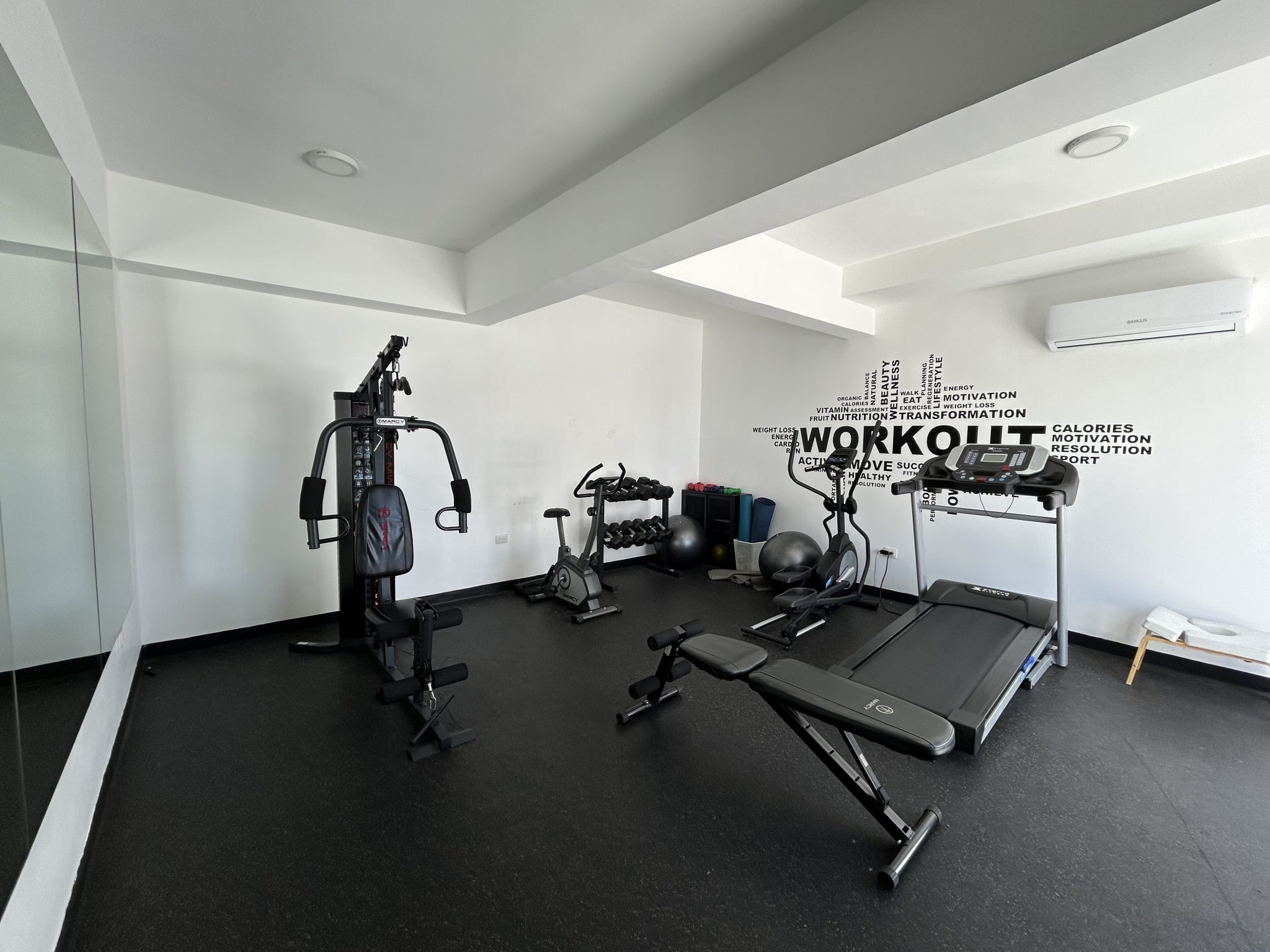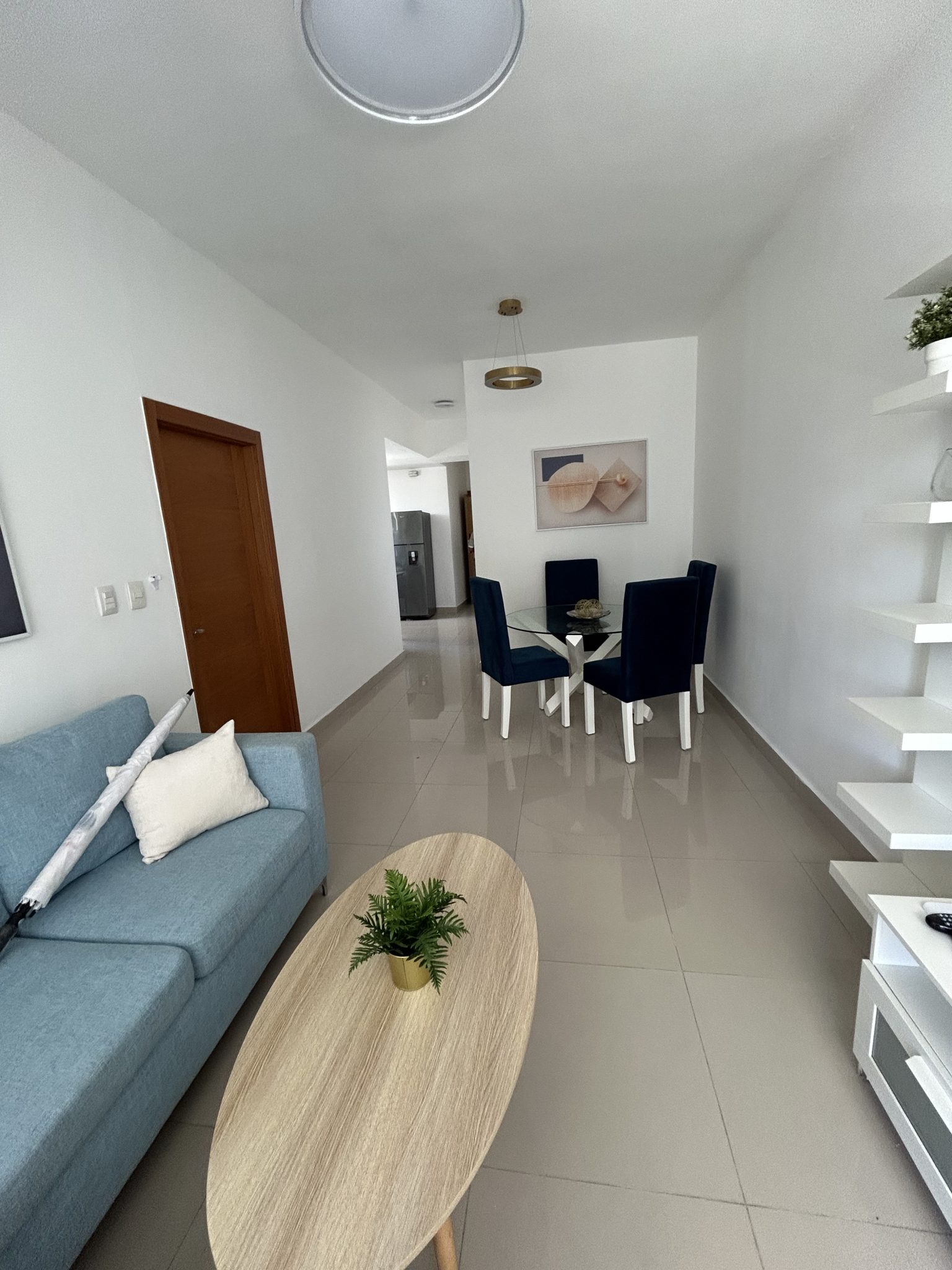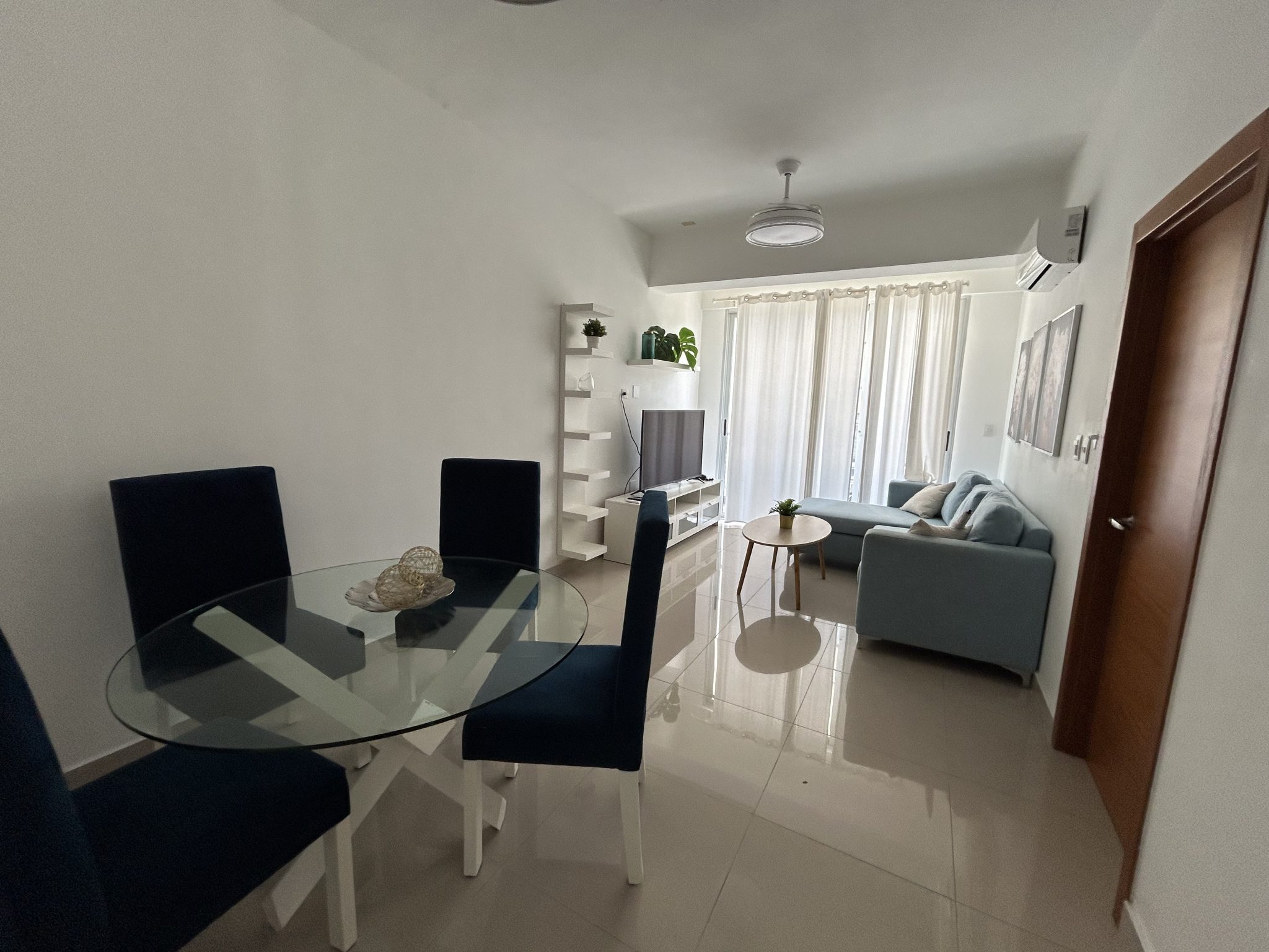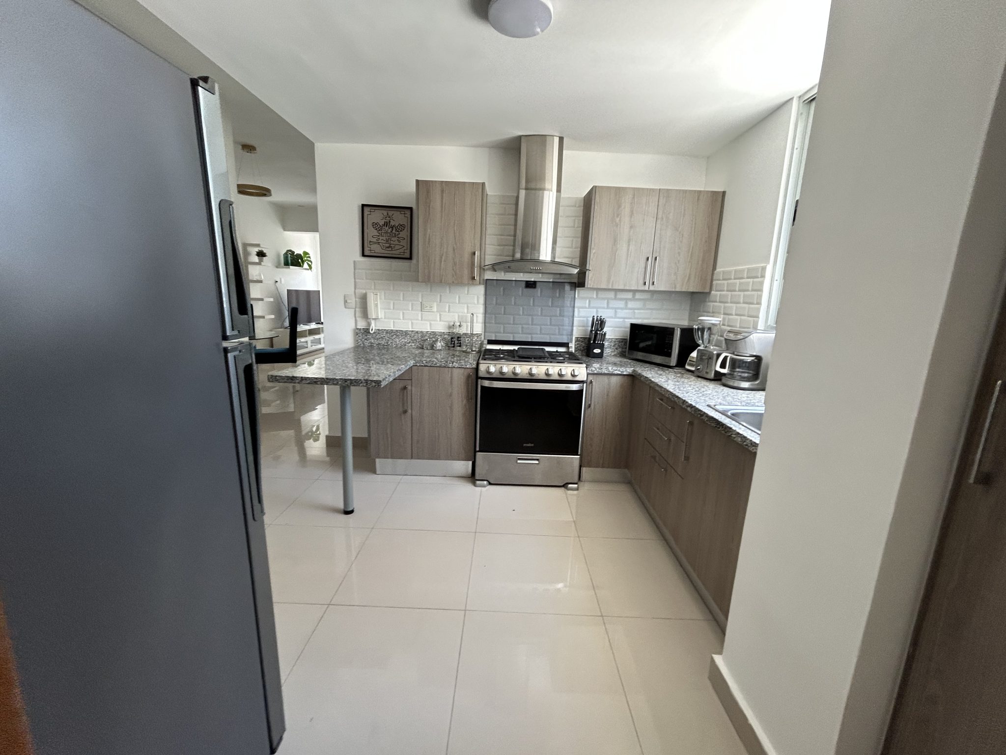 Interiores: Sala luminosa con balcón, cocina moderna equipada, 1 habitación con walkin closet y baño privado, aire acondicionado, 1.5 baños, 1 parqueo.